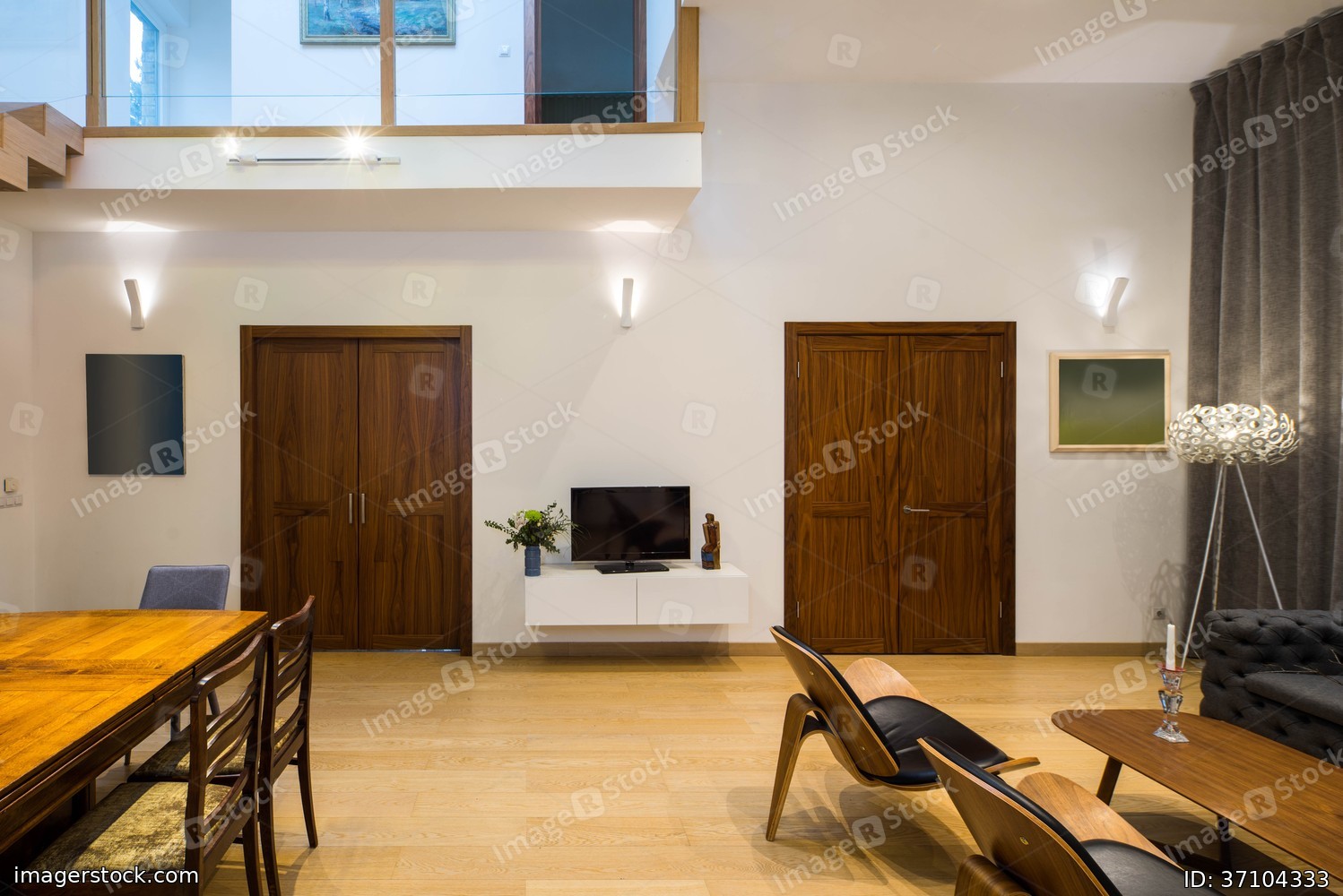 Modern interior of private house. Living room with wooden furniture. View of wall with doors.