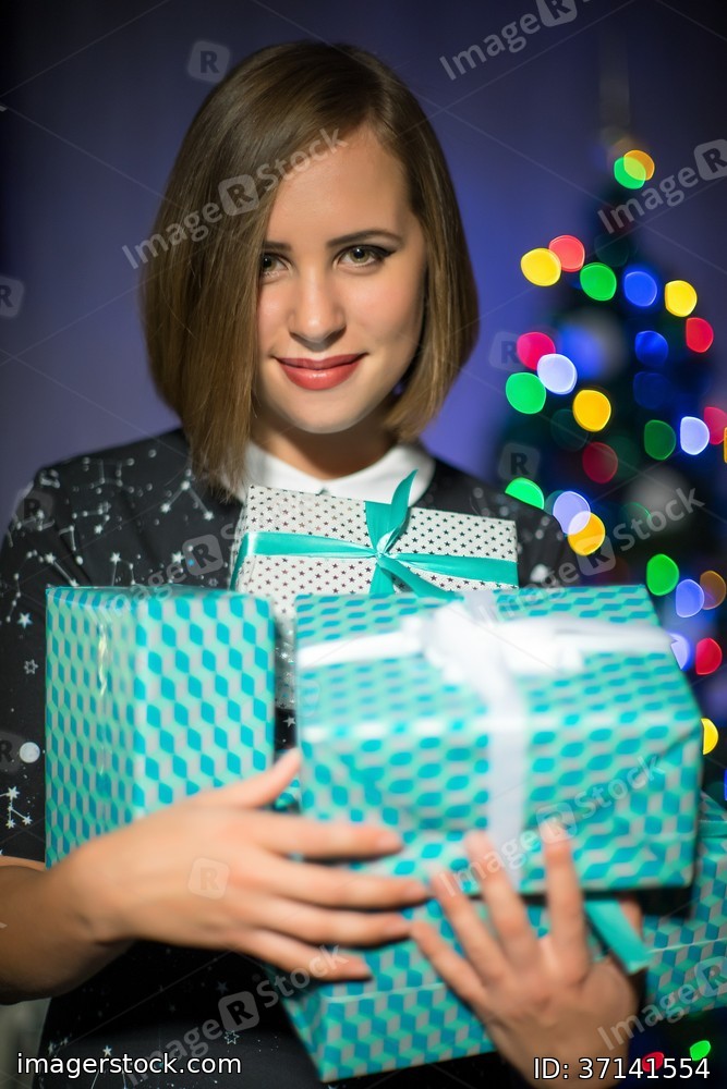 A girl with New Year gifts and christmas tree on the background.
