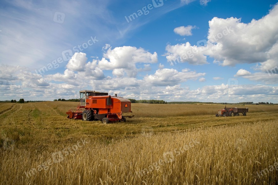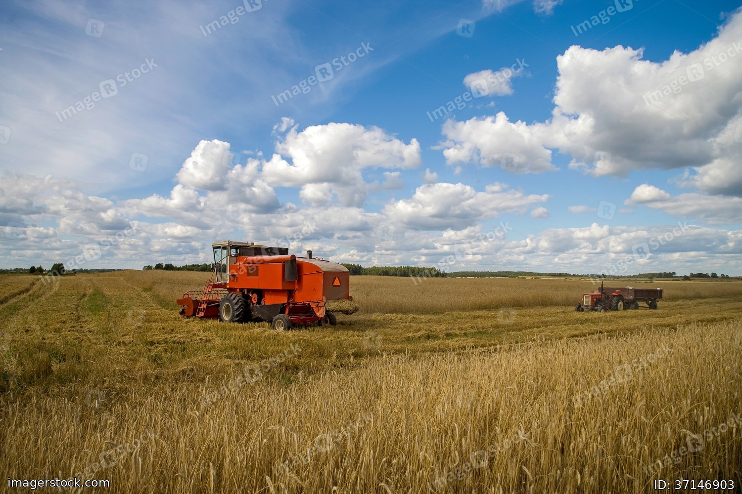 Harvesting of wheat. Tractor and special harvesting equipment.