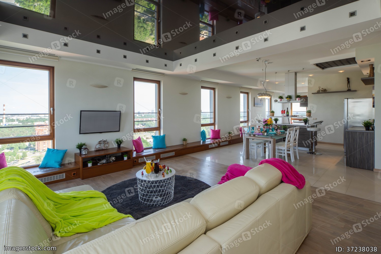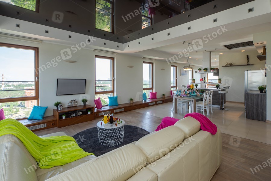 Modern interior of studio apartment in light tones. Living room and kitchen. Wall with windows.