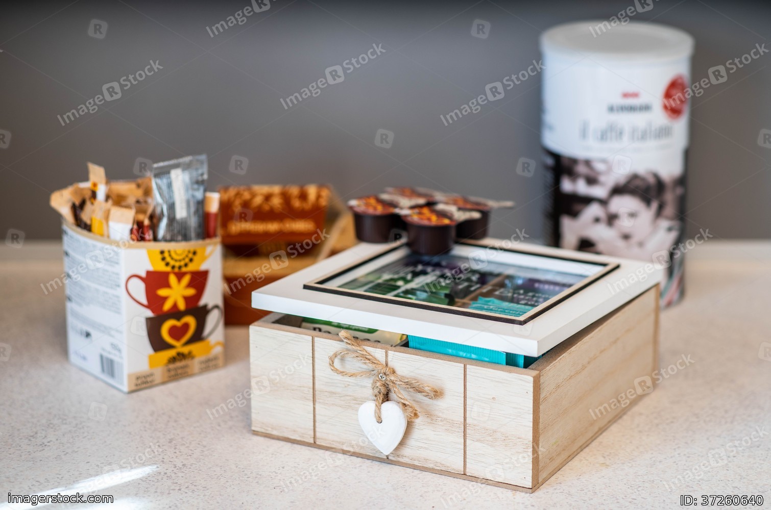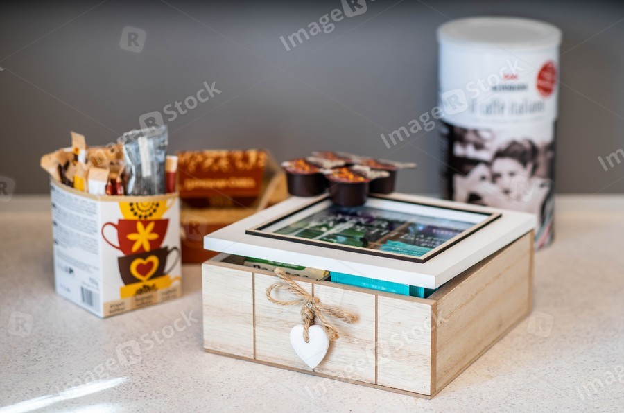 Close up of wooden box with tea. Coffee, sugar and cream.