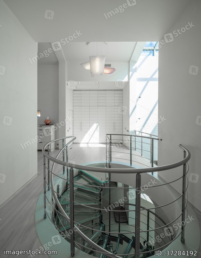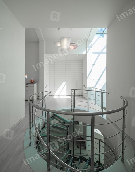 White interior of luxury private house. Glass and metal spiral staircase.