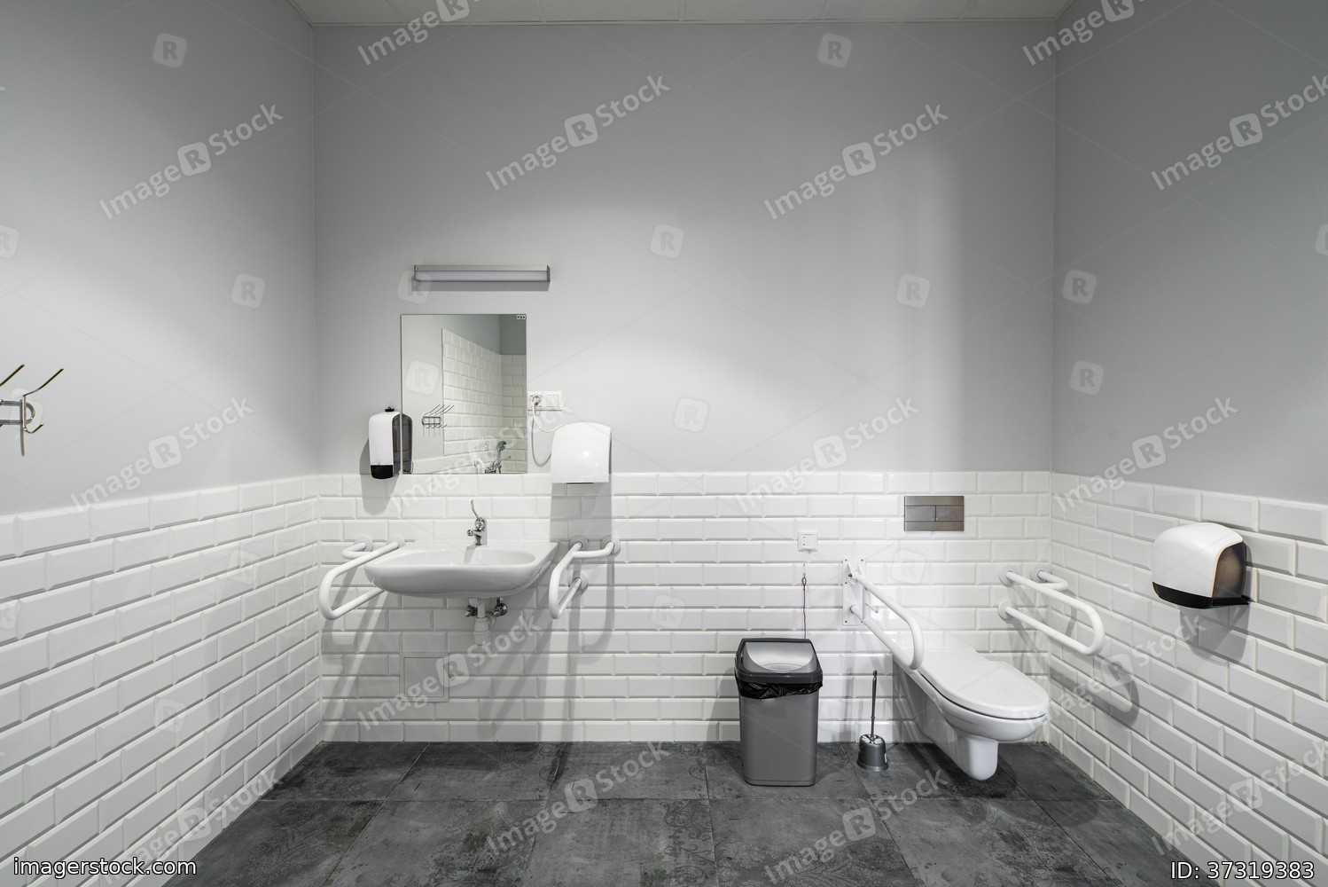 The interior of bathroom with facilities for the disabled. White bricks. Grey tile.