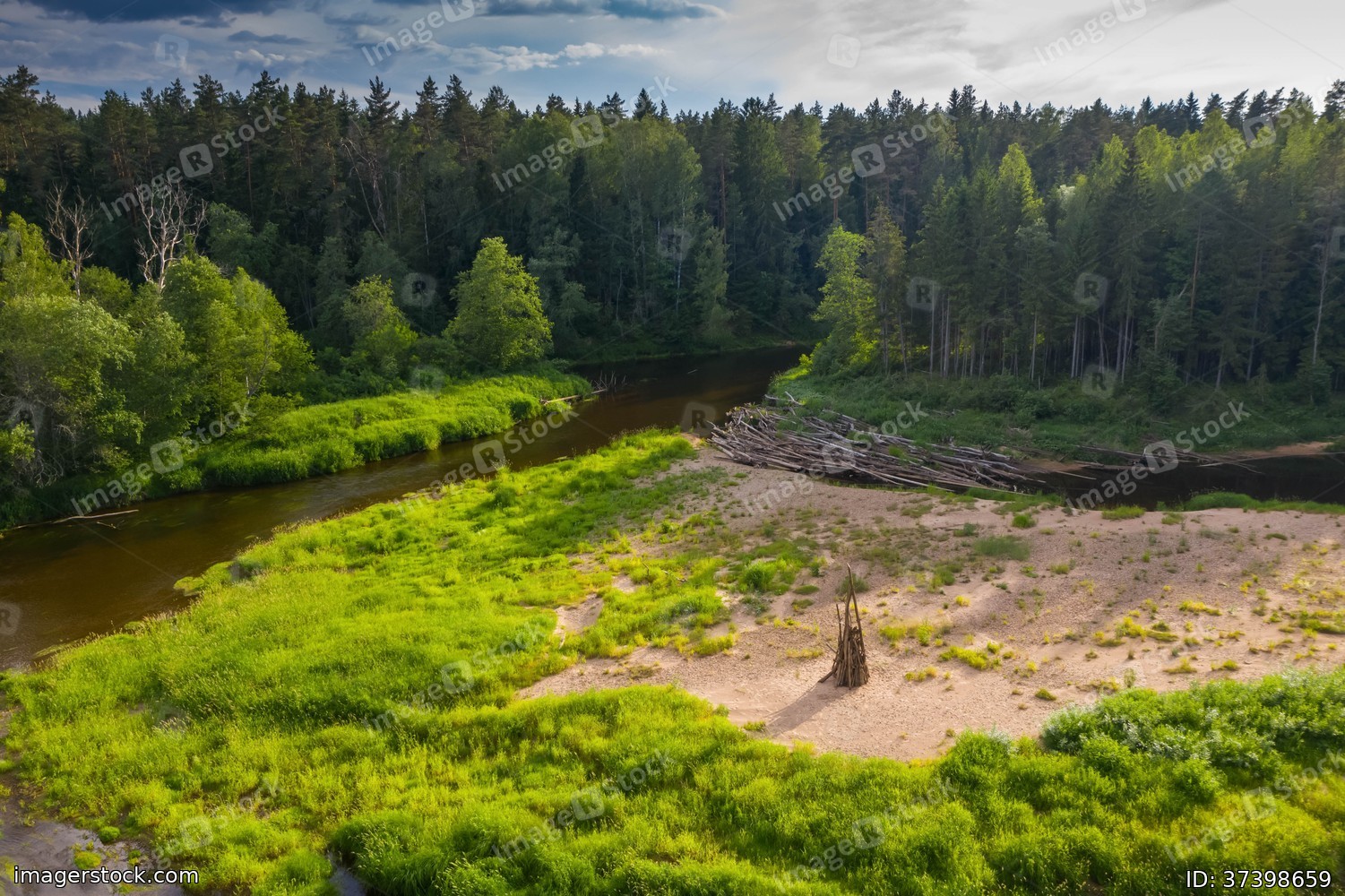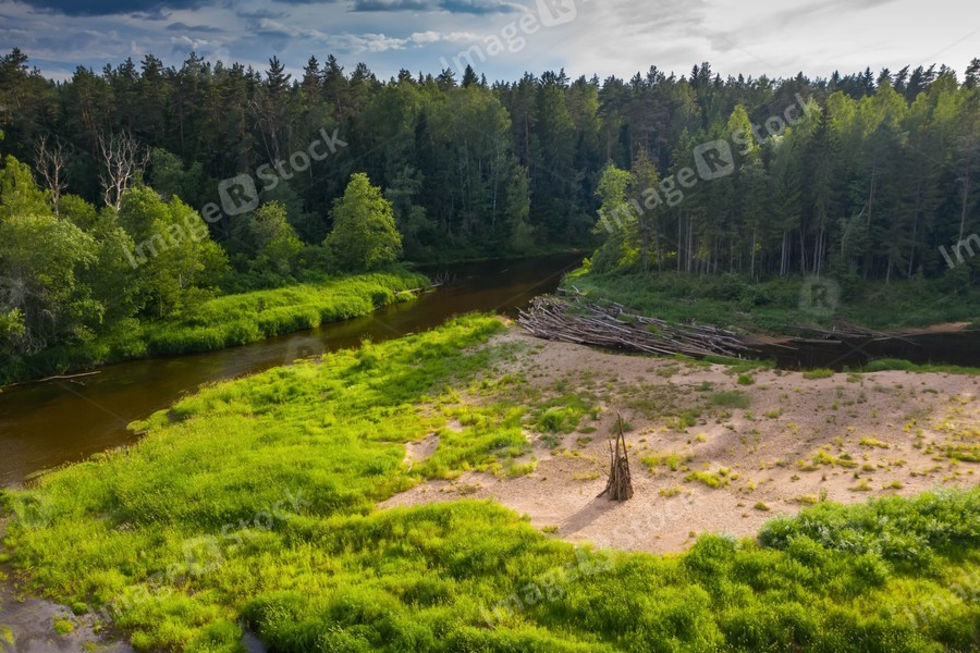 Scenic drone view of the green forest and the river. Beautiful summer landscape. Woodpile for midsummer celebration