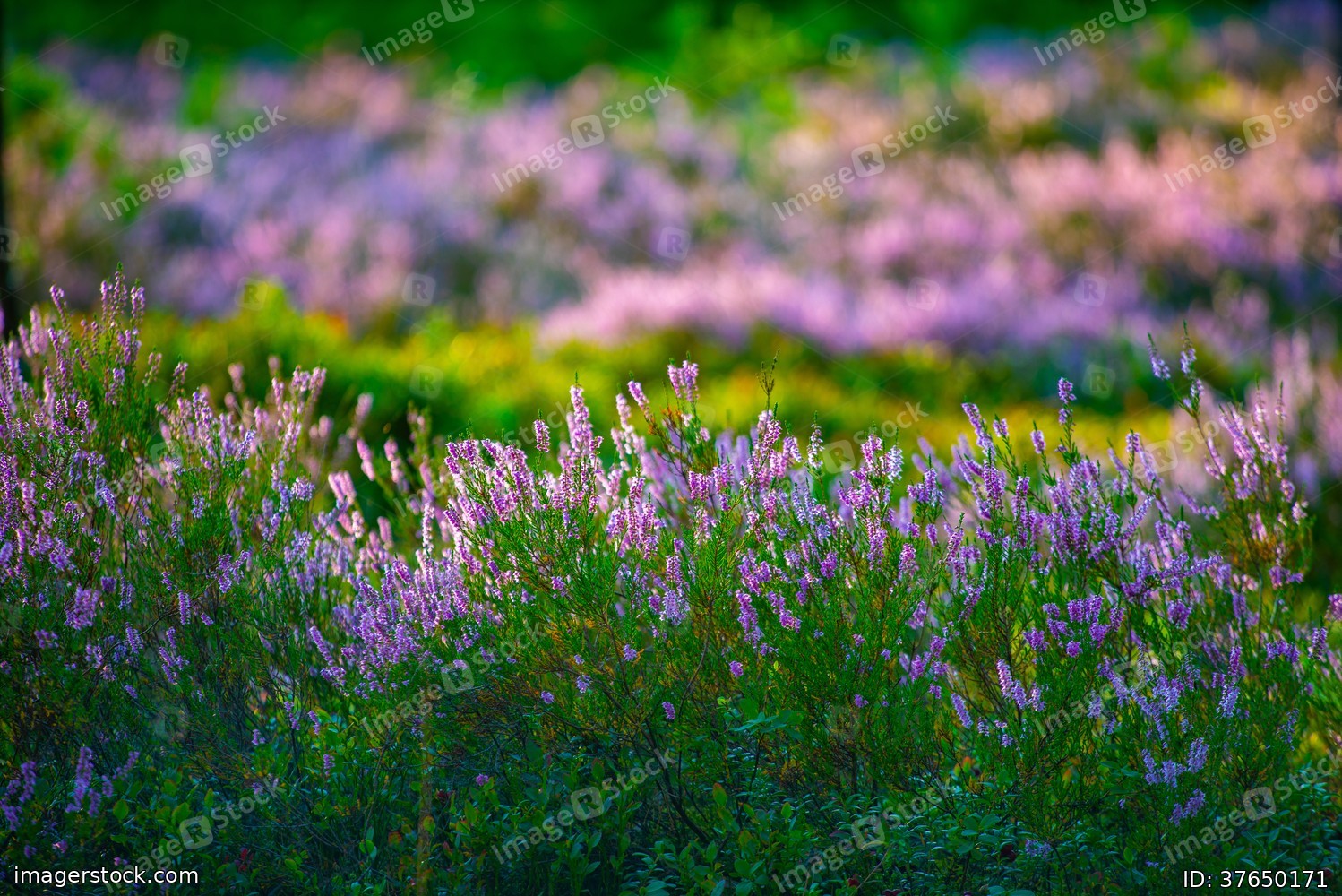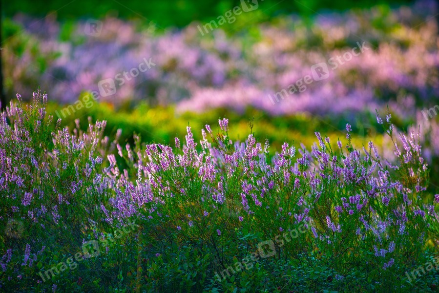 Sunny day. Blooming heather. Beautiful lawn in the forest.