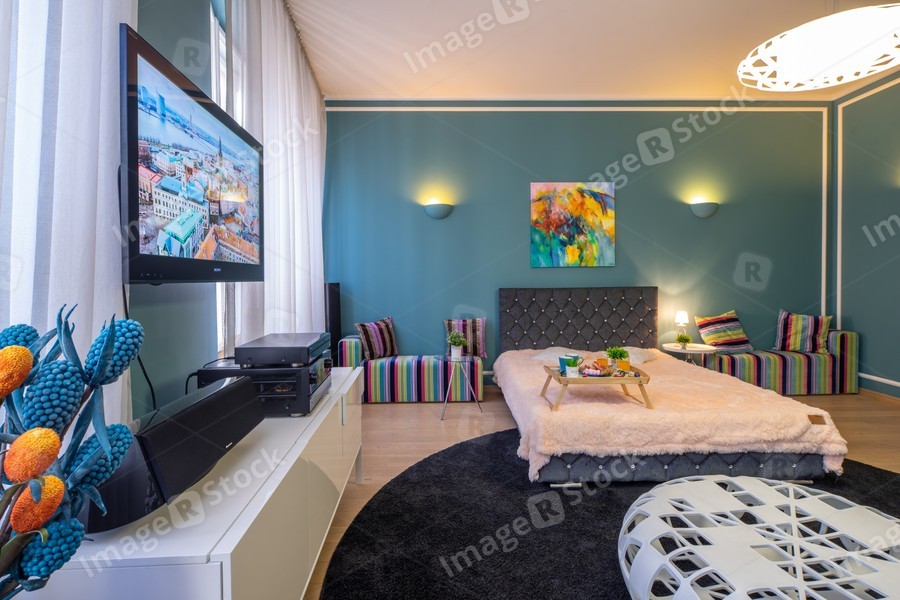 Modern interior of spacious studio apartment. Living room. King-size bed.