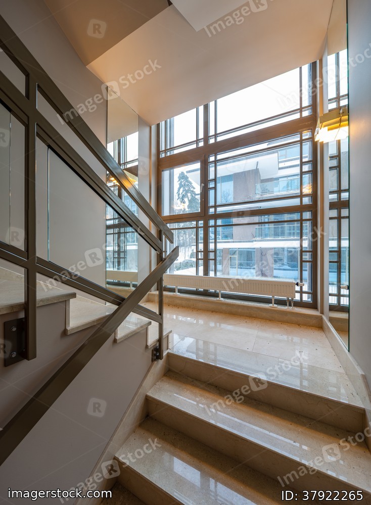 Modern interior of entrance in apartment building. Staircase. Window.