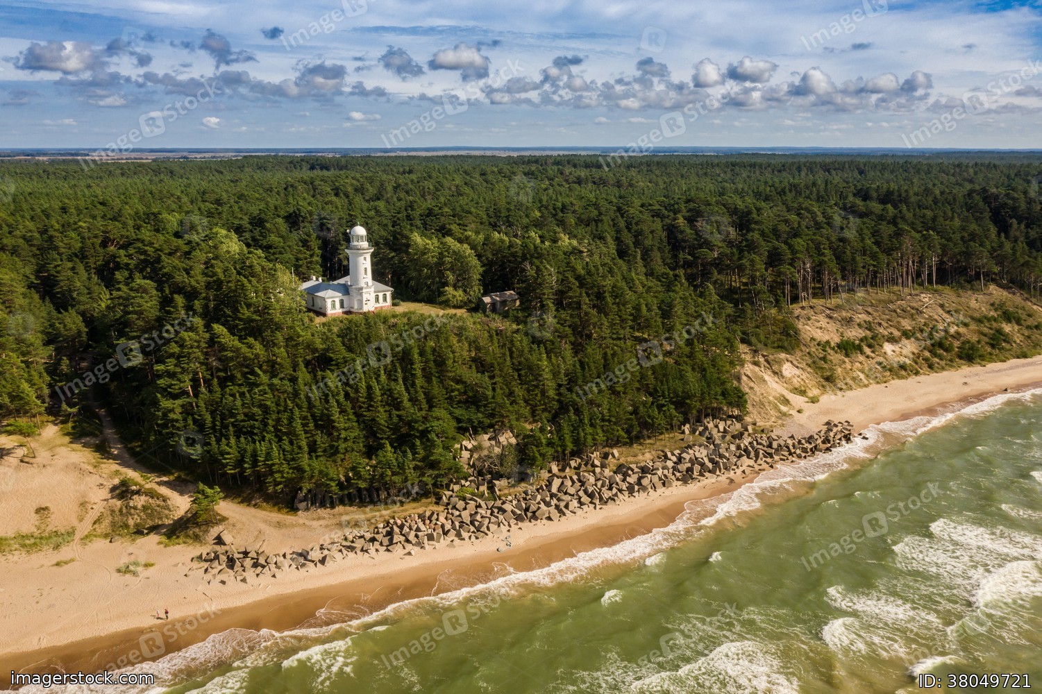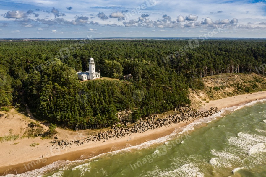 Top view of the sea and the Uzhava lighthouse. Blue sky. Green forest.