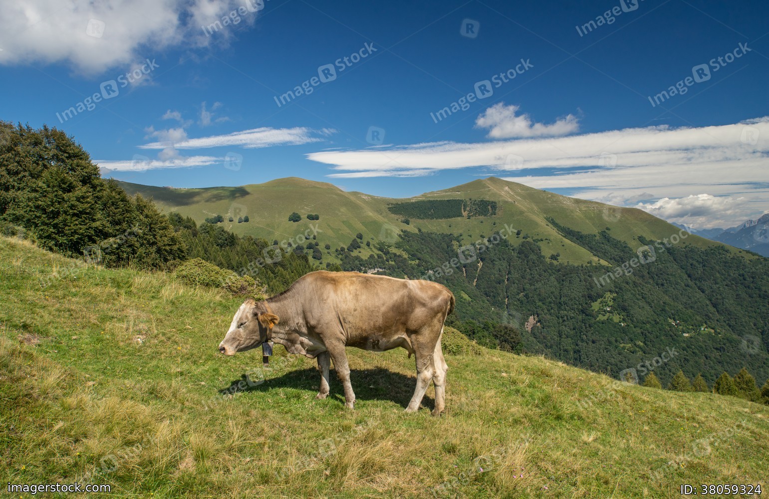 The pasture in the mountains. Cows grazing on the hills. Italy.