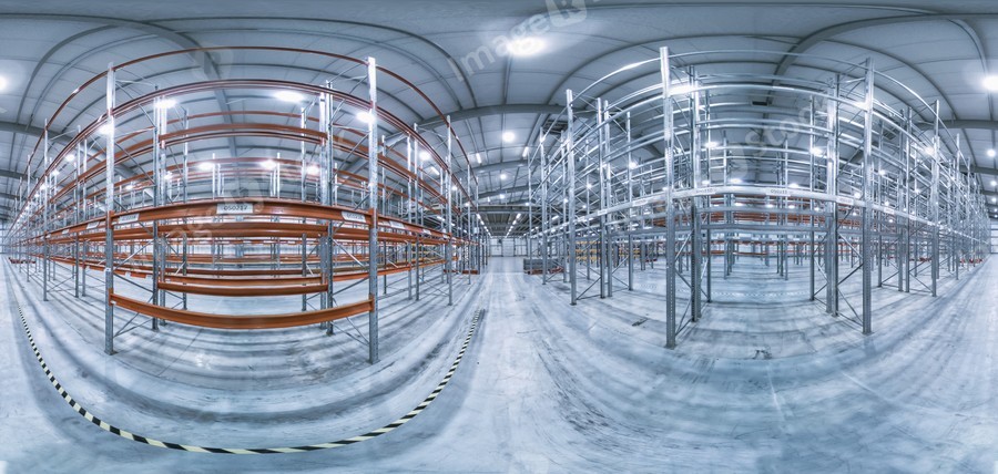 Spherical panorama 360 of empty industrial warehouse with metal rack.