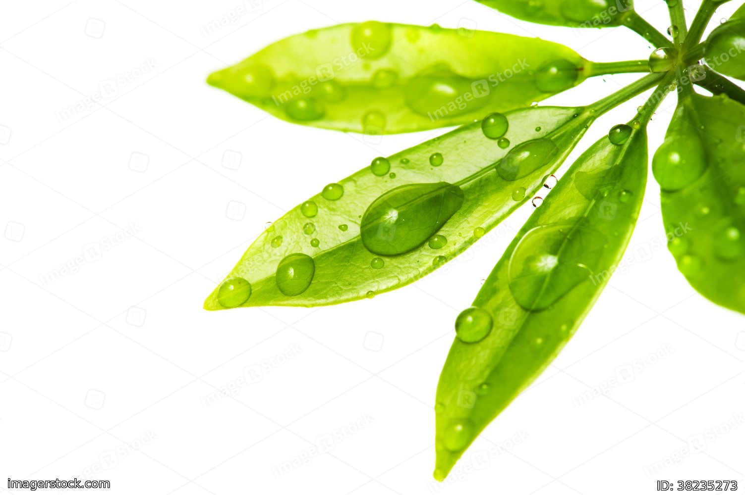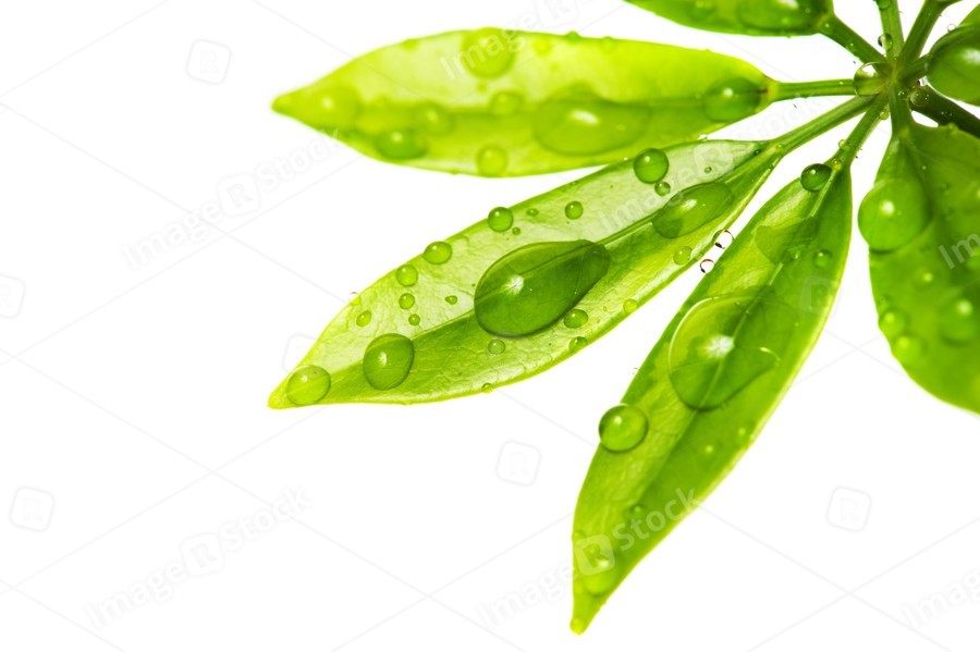 Water drops on fresh green leaves. Isolated on white background