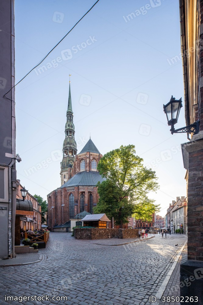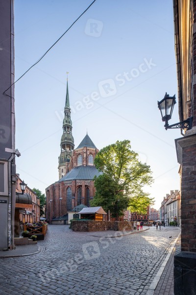 St. Peter's Church, a Lutheran church in Riga, the capital of Latvia. Blue sky.