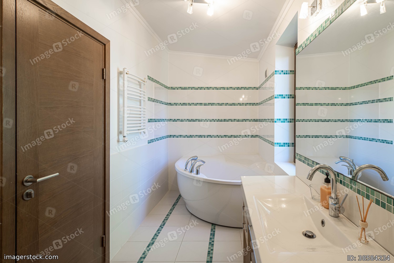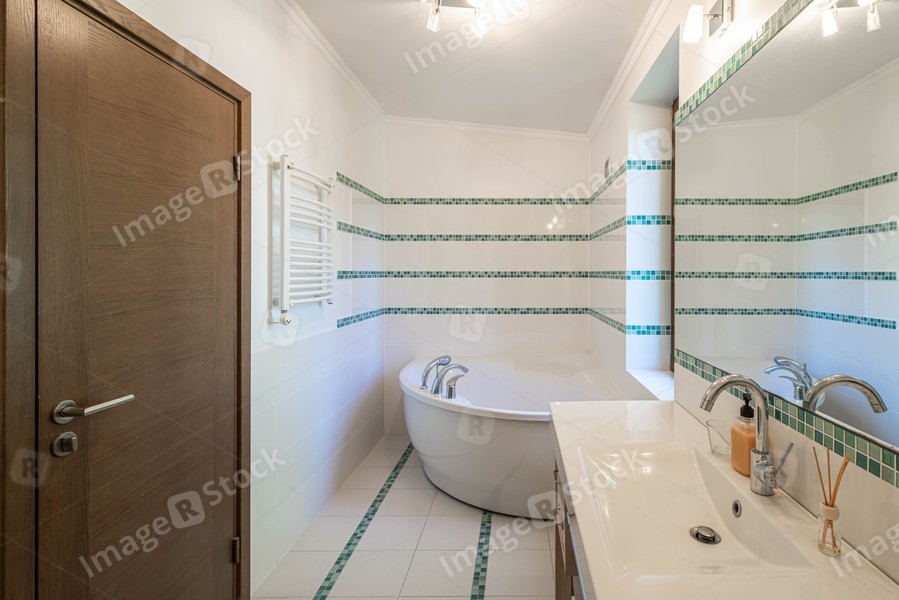Modern light interior of bathroom in apartment. White tile. Huge bath. Wooden door. Sink and mirror.
