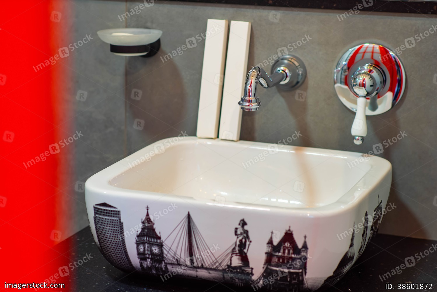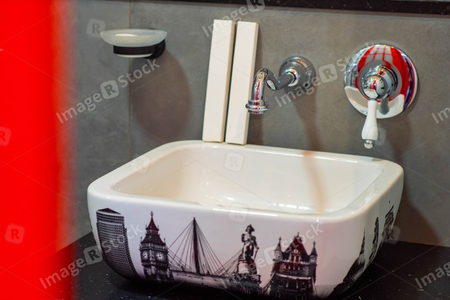 Close-up of stylish sink and faucet in loft interior of bathroom. Grey tile. Soap stand on the wall.