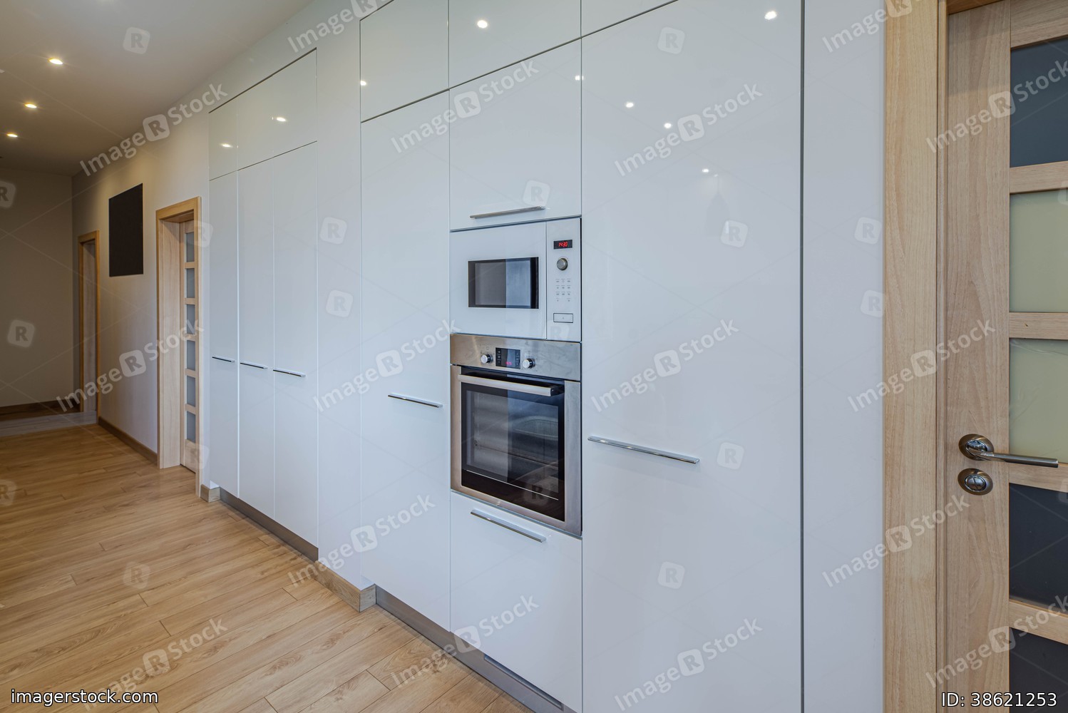 Wall with built-in kitchen set with oven and microwave. Contemporary interior. Luxury flat.