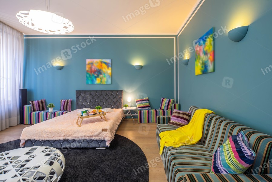 Modern interior of spacious studio apartment. Living room. King-size bed.
