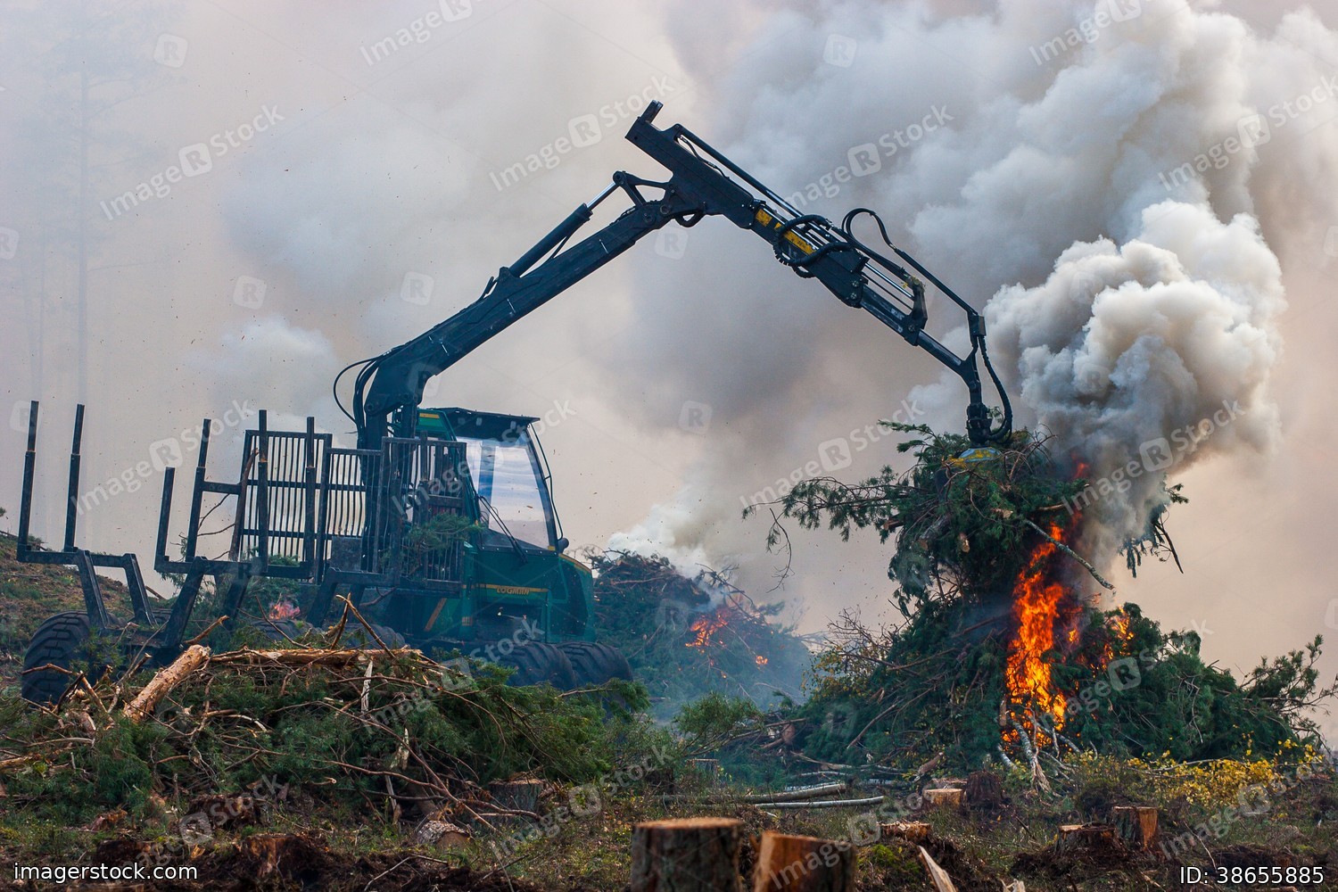 Forest cutting, burning of forest waste. Smoke and fire, tractor.