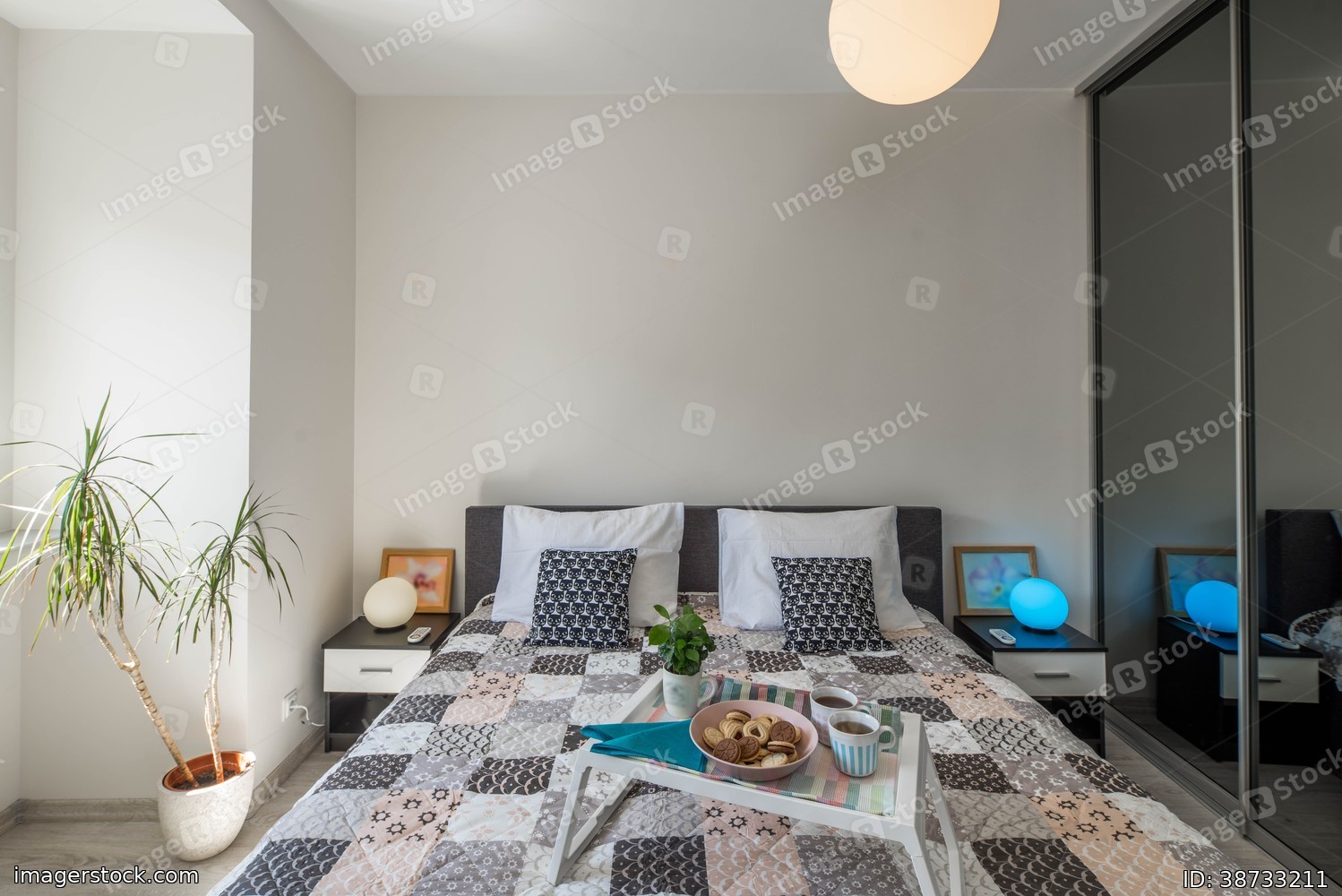 Modern interior of bedroom. Tray with food on the bed. Bedsides with round lamps.