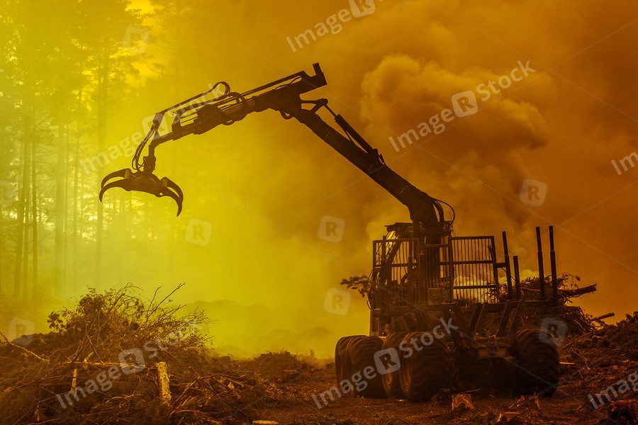 Forest cutting, burning of forest waste. Smoke and fire, tractor.