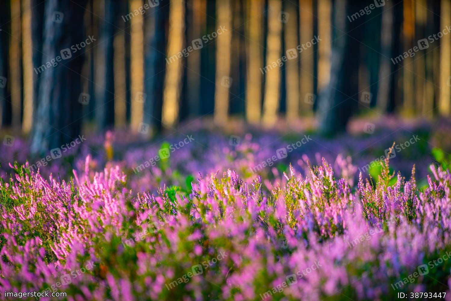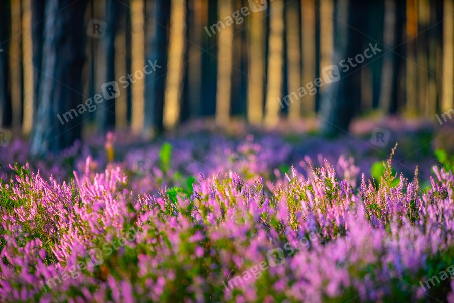 Sunny day. Blooming heather. Beautiful lawn in the forest.