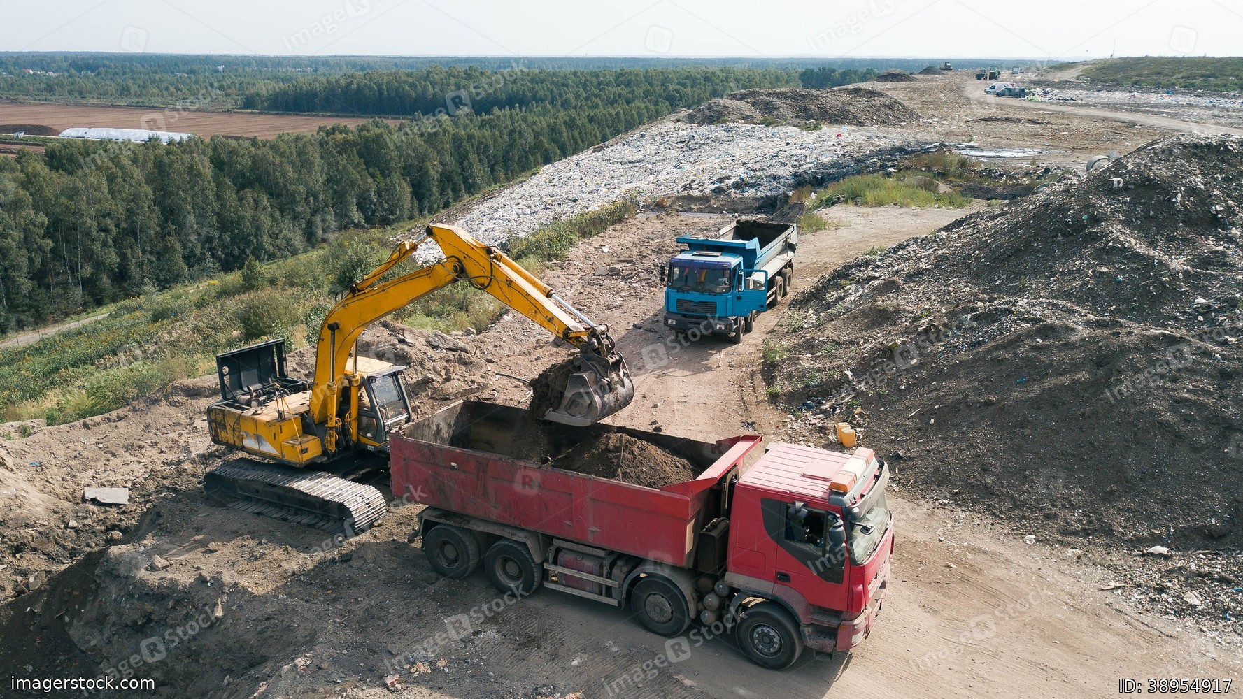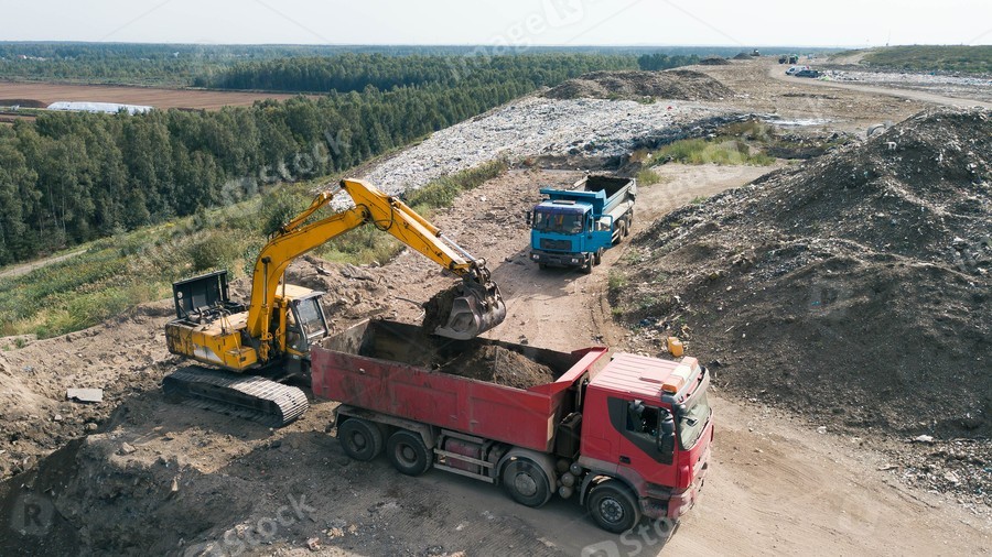 Aerial view of construction works. Earthmoving at open pit mining. Heavy equipment. Excavator loads ground in truck.