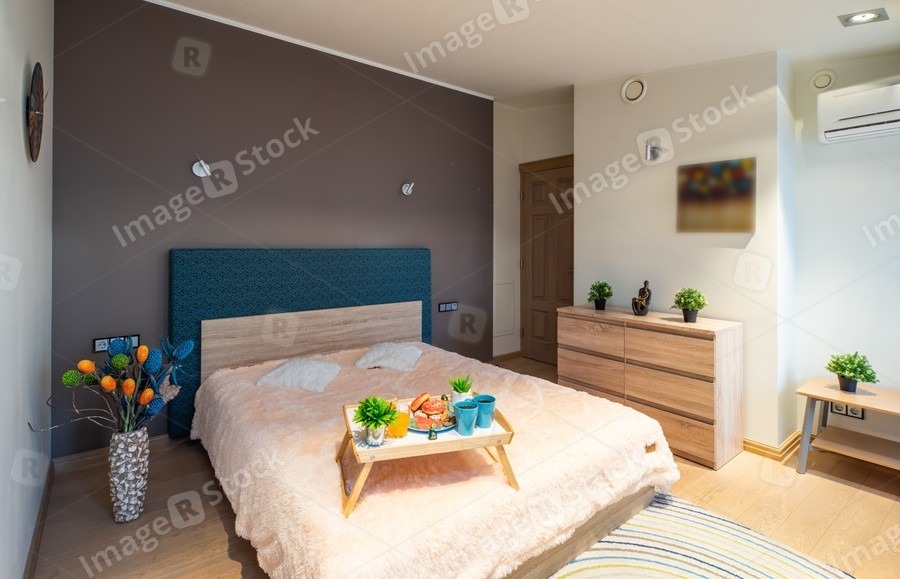 Interior of bedroom. Modern apartment. King-size bed. Tray with food.
