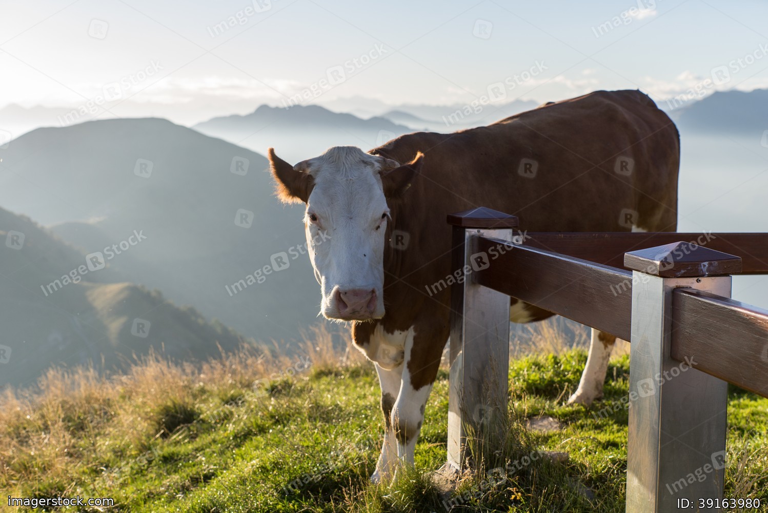 The pasture in the mountains. Cows grazing on the hills. Italy.