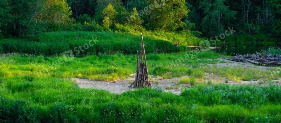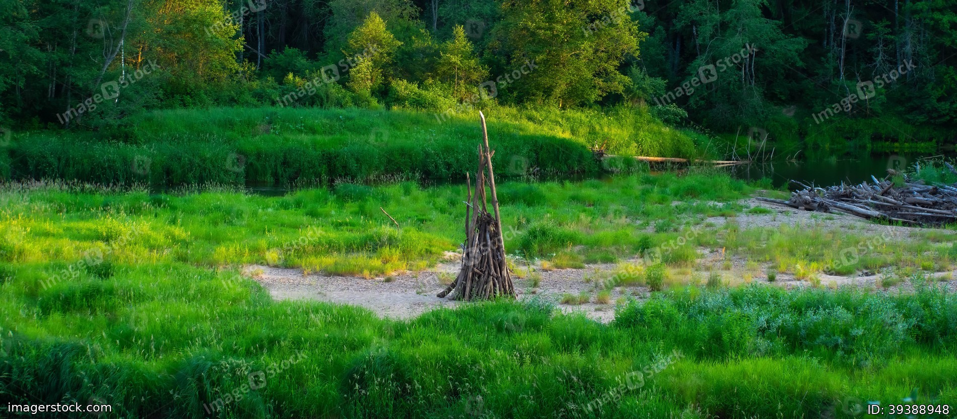 Close-up of woodpile of dry branches for a huge fire. Midsummer celebration preparation. Scenic panorama landscape. Sunset light.