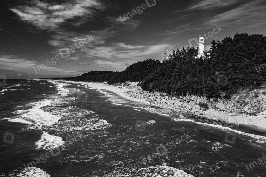 Top view of the Baltic sea and the Uzhava lighthouse. Black and white.