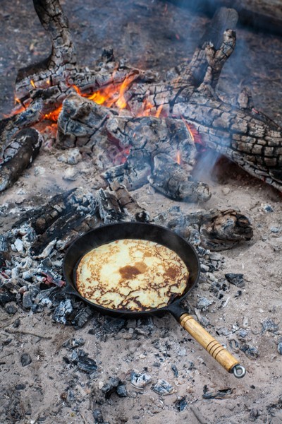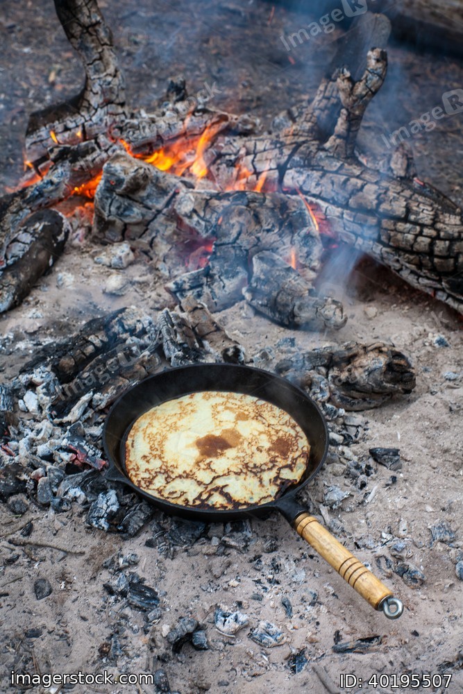 Cooking pancakes on the fire in the forest.