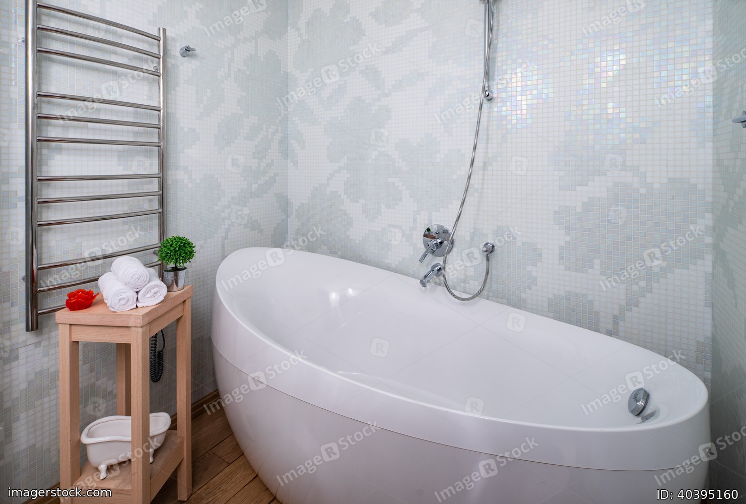 Light spacious bathroom. White tile with pattern.