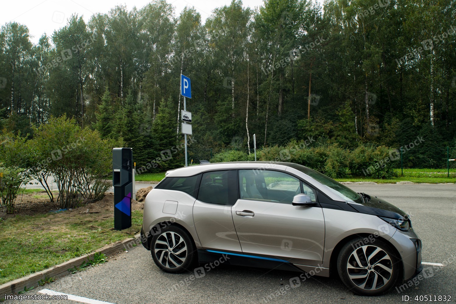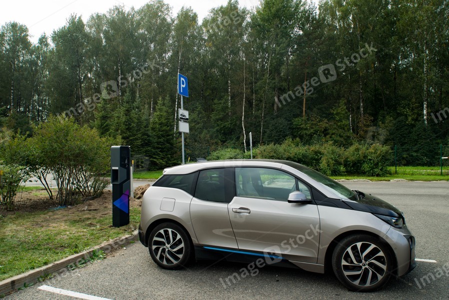 Parking near forest at summer day. Electric car near charging station. Eco-friendly transport.