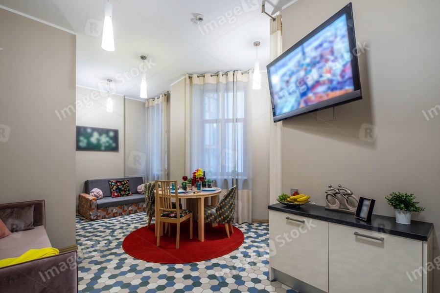 Modern interior of light studio apartment. Living room.