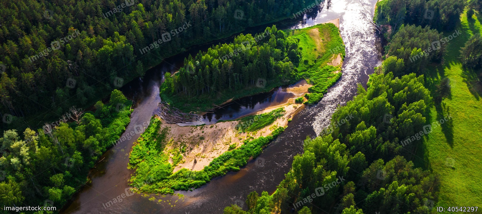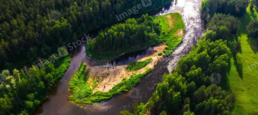 Top drone landscape of summer forest and the river. Green trees. Beautiful latvian nature.