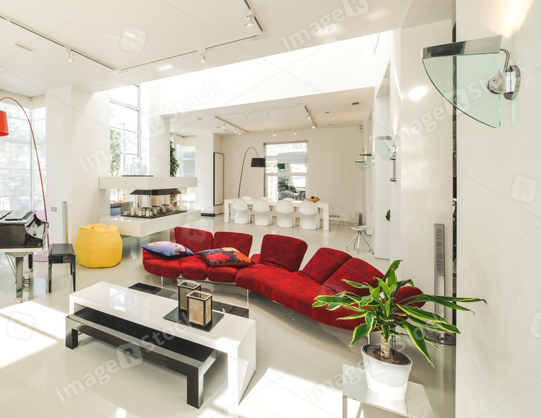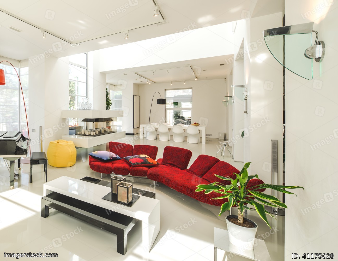 Modern interior. Luxury private house. Living room. Red sofa, piano