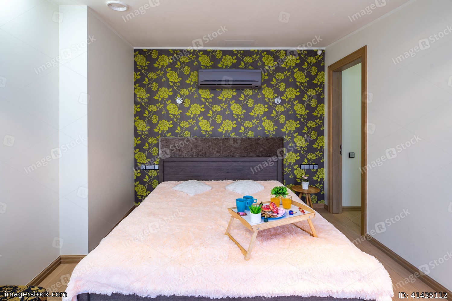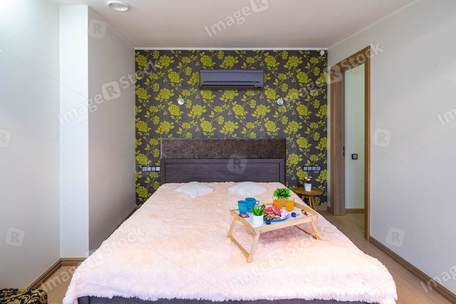 Bedroom in modern apartment. Interior. Light spacious room. King-size bed.