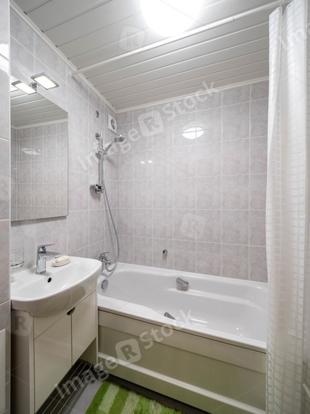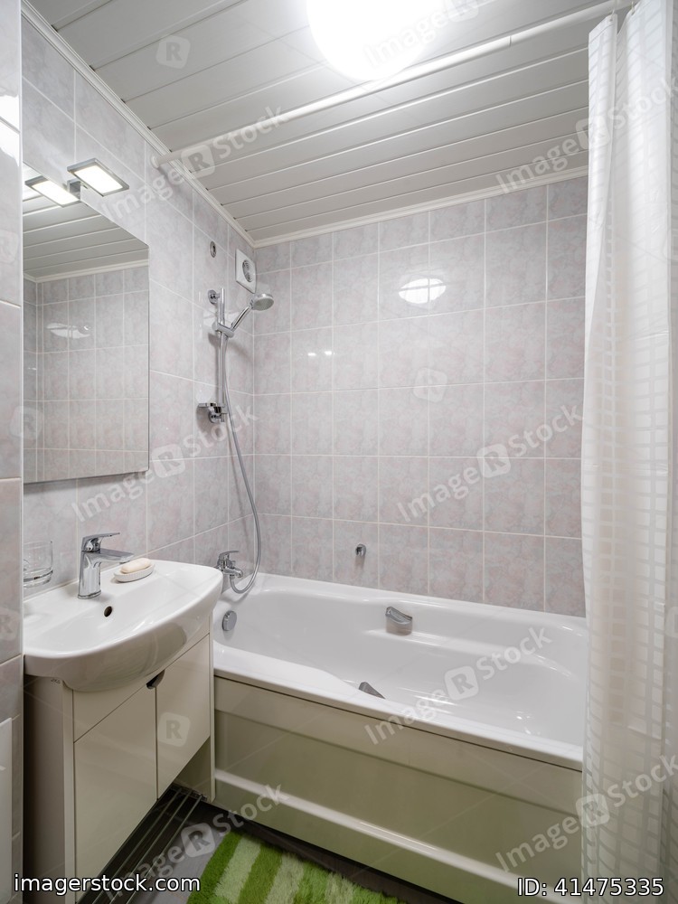 Modern light interior of bathroom in apartment. White tile. Bath tub, sink and mirror. Green mat.