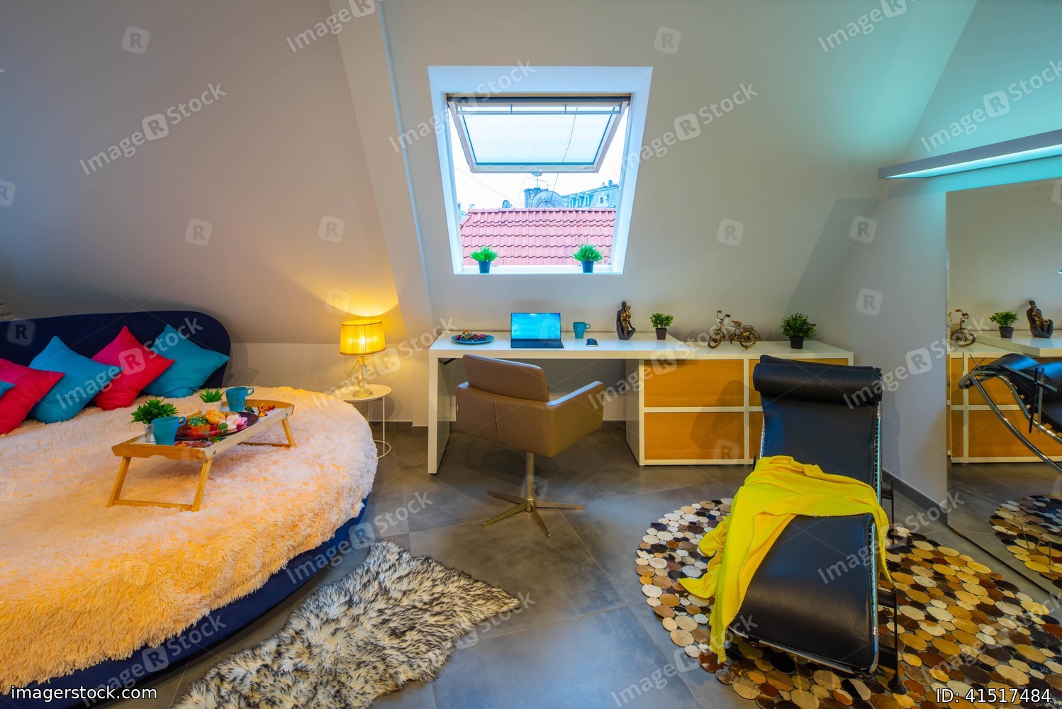 Loft interior of bedroom in modern apartment. Tray on the round bed. Roof window. Place to work. Lounge chair.
