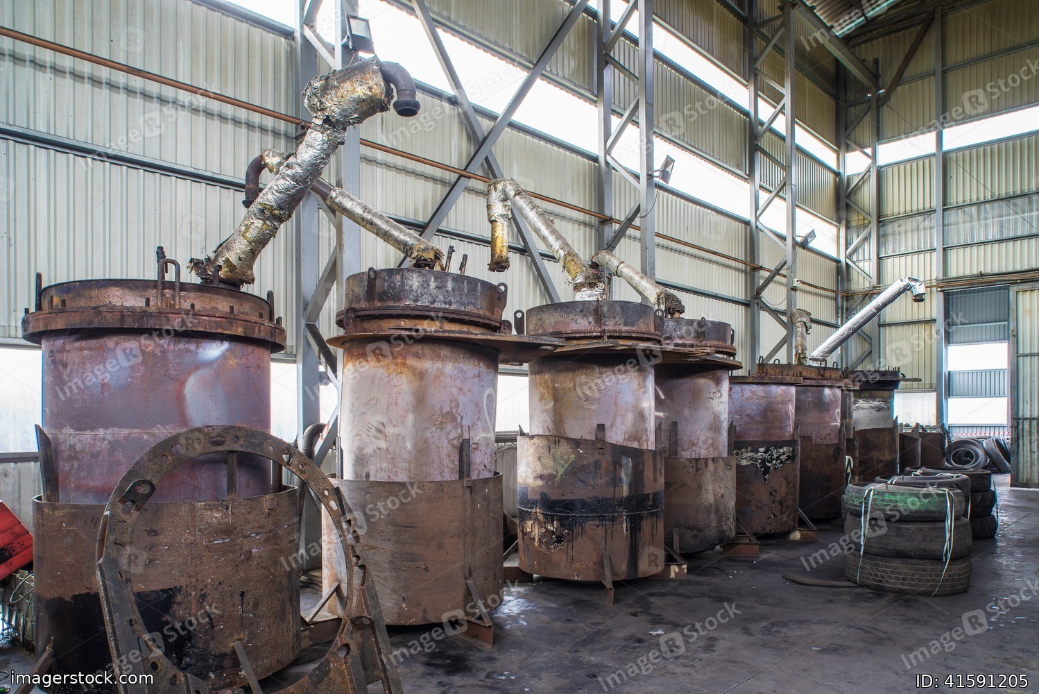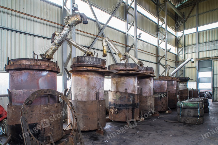 Furnaces for pyrolysis, processing and disposal of old tires. Industrial photo.