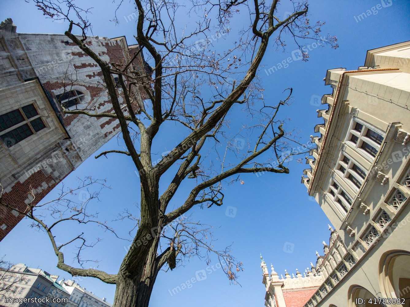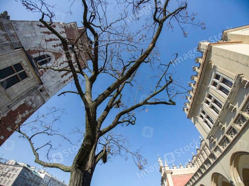 Bottom view of dry dead tree and modern European architecture.