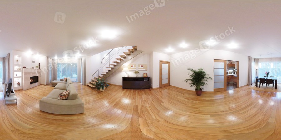 Modern interior of a private house, 360-degree spherical panorama.