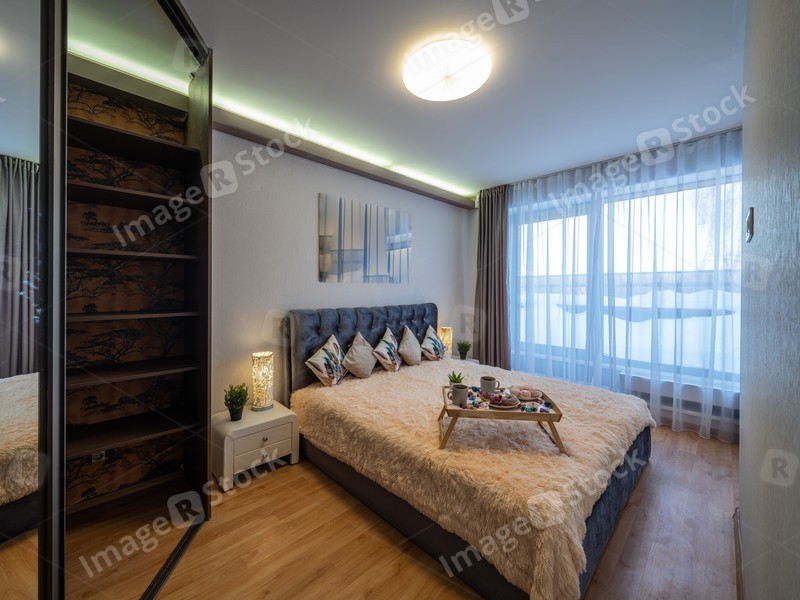 Modern interior of bedroom in luxury apartment. Breakfast on bed.