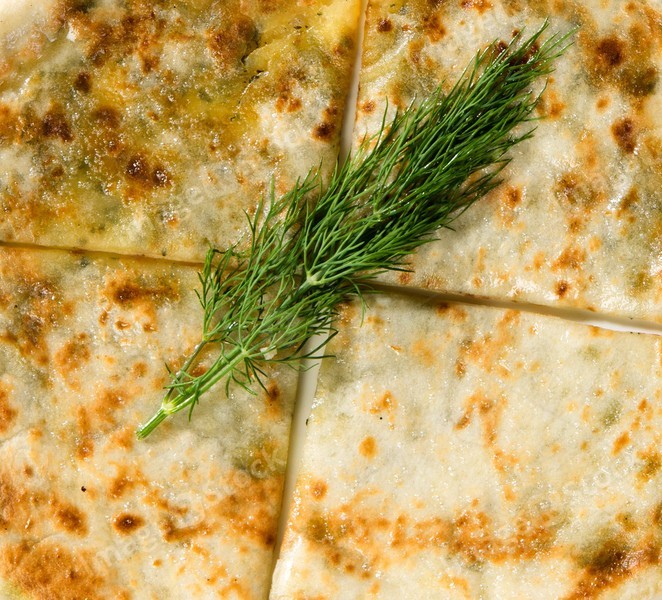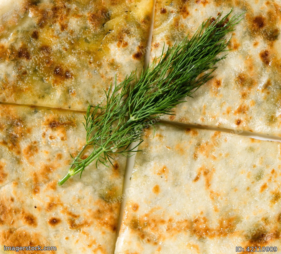 Close-up of a delicious baked khachapuri and a sprig of dill.