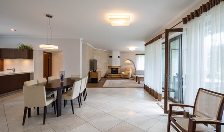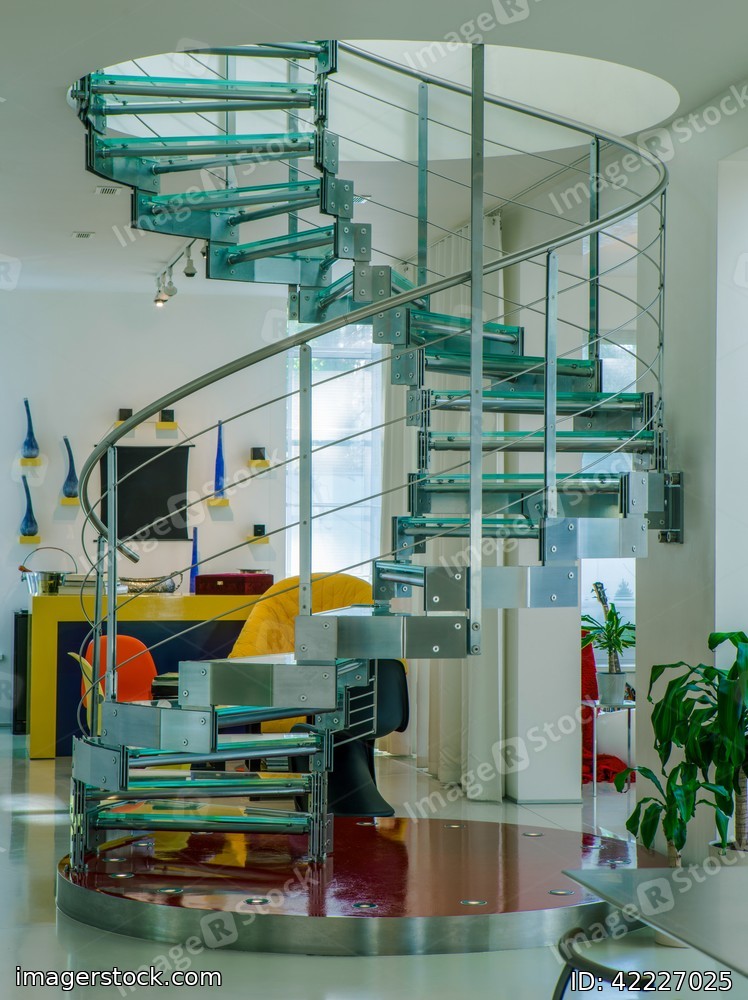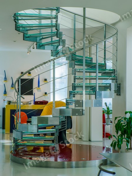 Modern interiro of luxury private house. Glass metal spiral staircase.