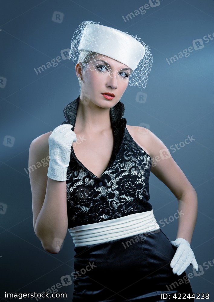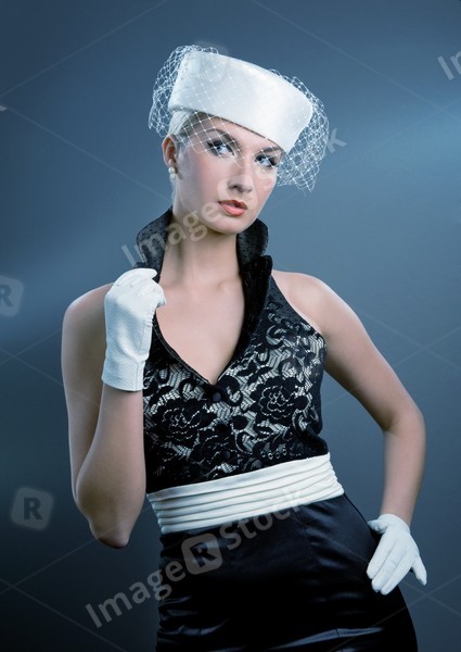 Beautiful young woman in white hat with net veil. Retro portrait