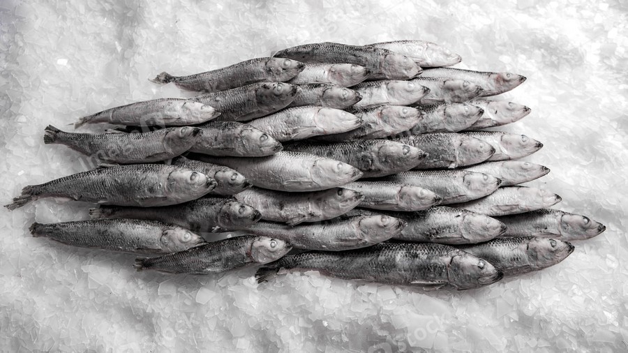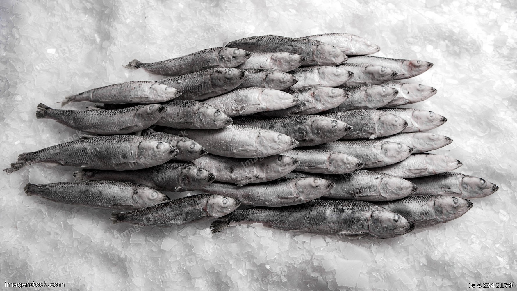 Close-up of fresh sprat on the ice in fish market. Winter fishing. Small silver fish production.