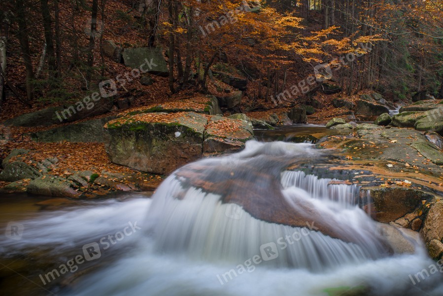 Autumn yellow forest and stone river stream.