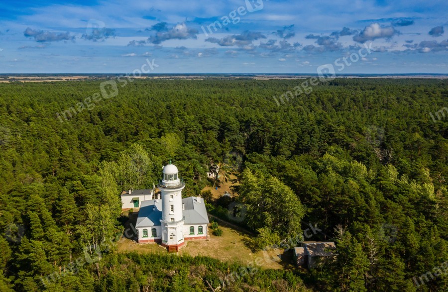 Top view of the Uzhava lighthouse. Blue sky. Green forest.