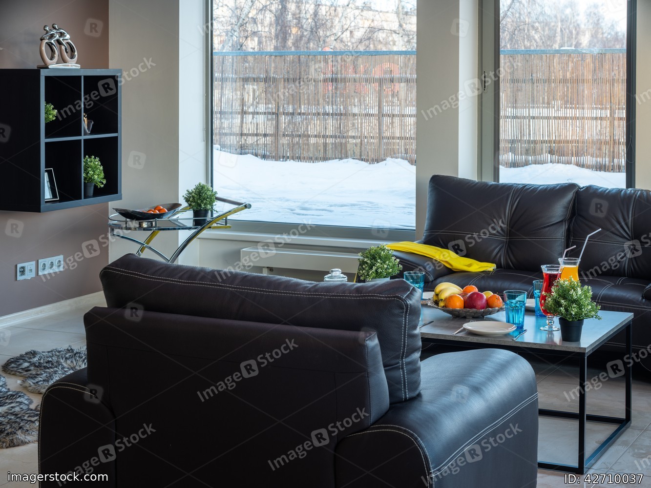 Close-up of table. Leather sofas. Plates and glasses. Fruits on plate.