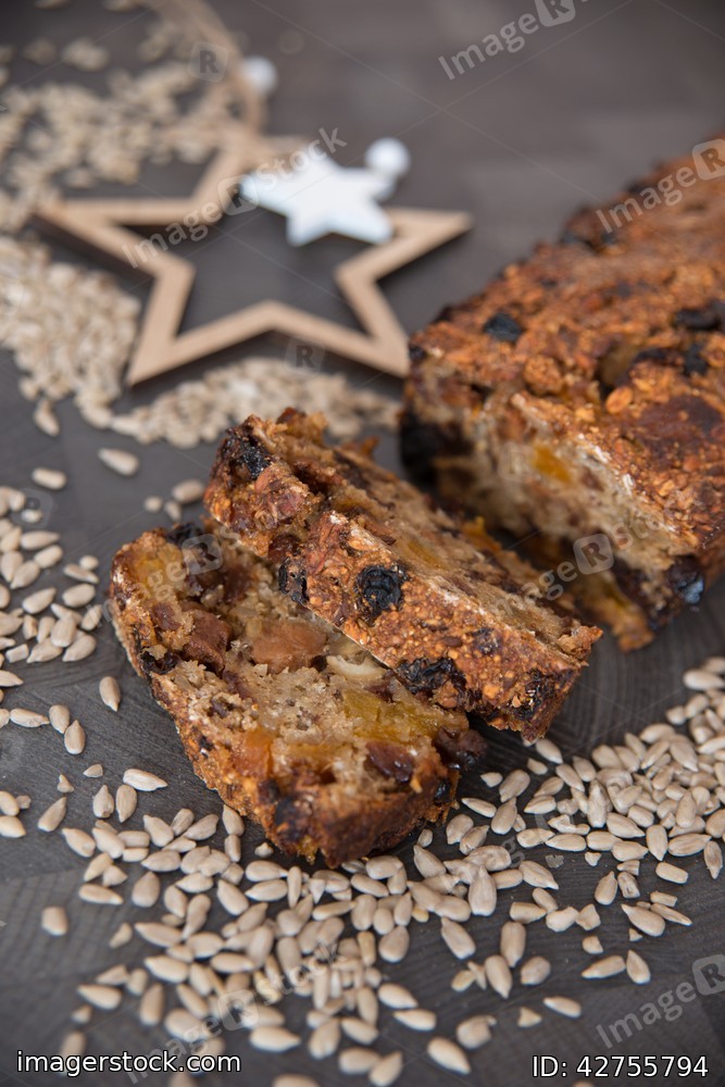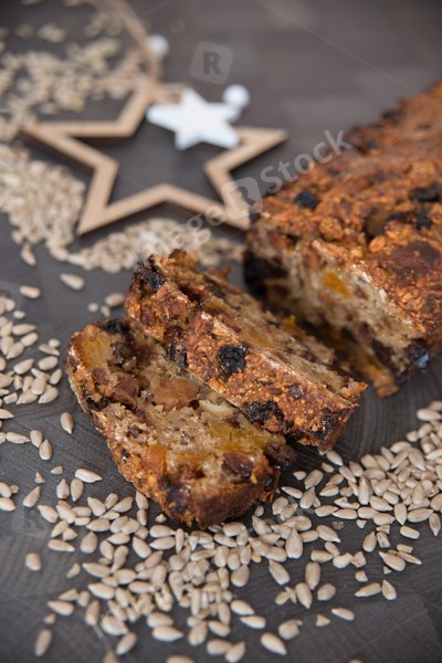 Homemade fruit bread with cosy winter decorations
